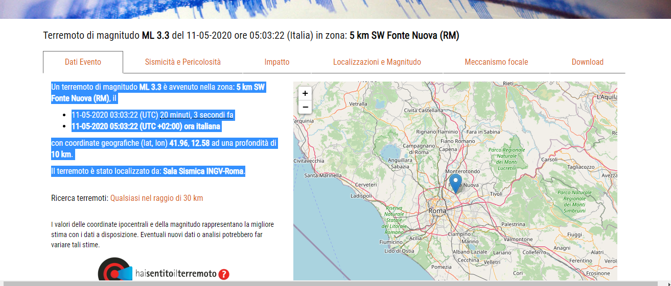 Terremoto Roma oggi, 11/05/2020
